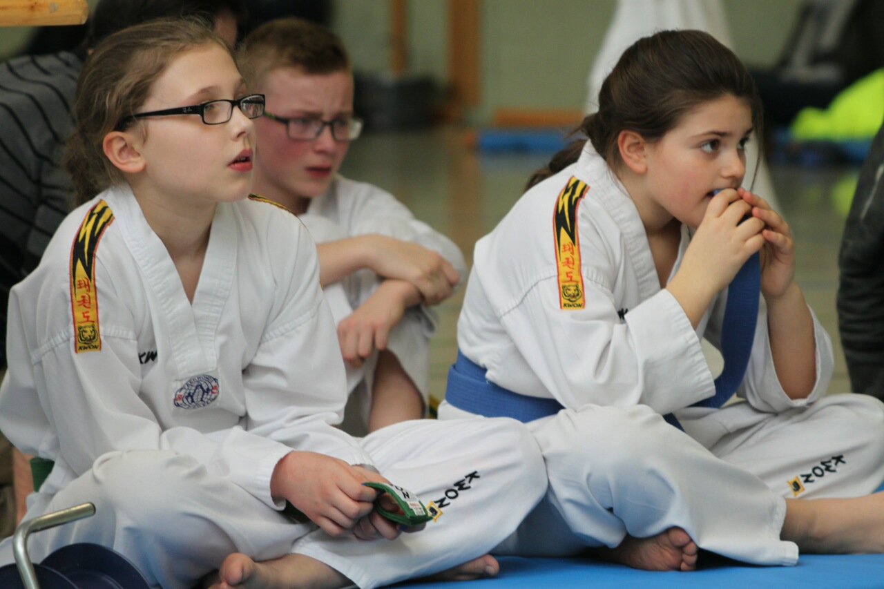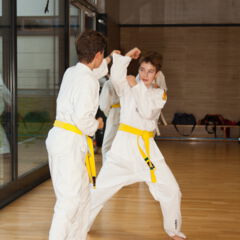 Mit der Unterstützung der Kindertrainer Ramon Benmesbah (1. Dan) und Philip Viertel (1. Dan) stellen sich am Samstag 32 Prüflinge im Alter von sechs bis 13 Jahren den unterschiedlichsten Prüfungsdisziplinen unterteilt in Grundschule, Formen, Freikampf, Selbstverteidigung, Bruchtest und Theorie.