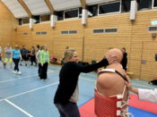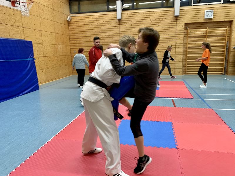 Kampfsportabteilungsleiter Patrick Meik (3. Dan) erarbeitete mit seinem Trainer- und Helferteam Ramon Benmesbah (1. Dan), Philip Viertel (1.Dan), Anja Walk und Lars Hagena ein Programm für den anderthalbstündigen Workshop.