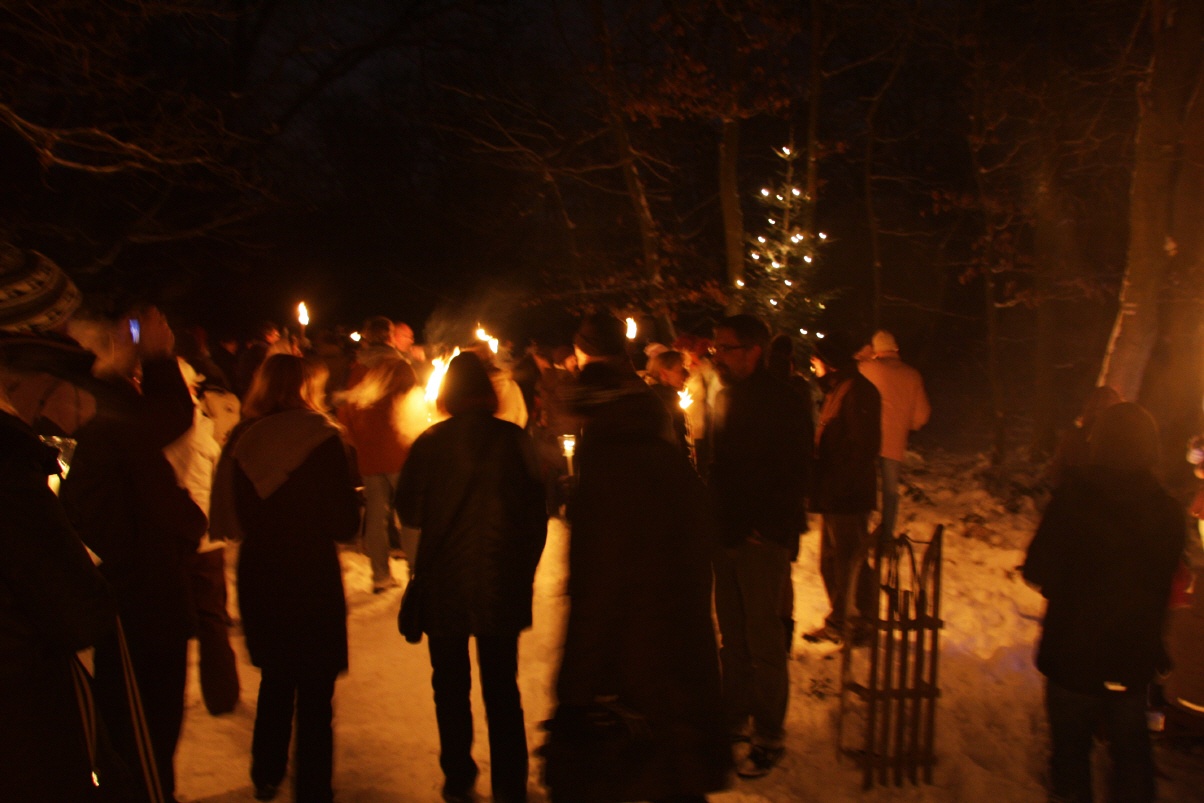 Am letzten Samstag feierte der TVD in Zusammenarbeit mit der evangelischen und der katholischen Kirchengemeinde die traditionelle Waldweihnacht. Die bereits seit 1994 am letzten Samstag vor Heiligabend durchgeführte Veranstaltung hat mit rund 350 Teilnehmern zu einem wahren Besucherrekord geführt. Leuchtende Kinderaugen begleiten mit brennenden Kerzen und Fackeln den Zug der Menschen.