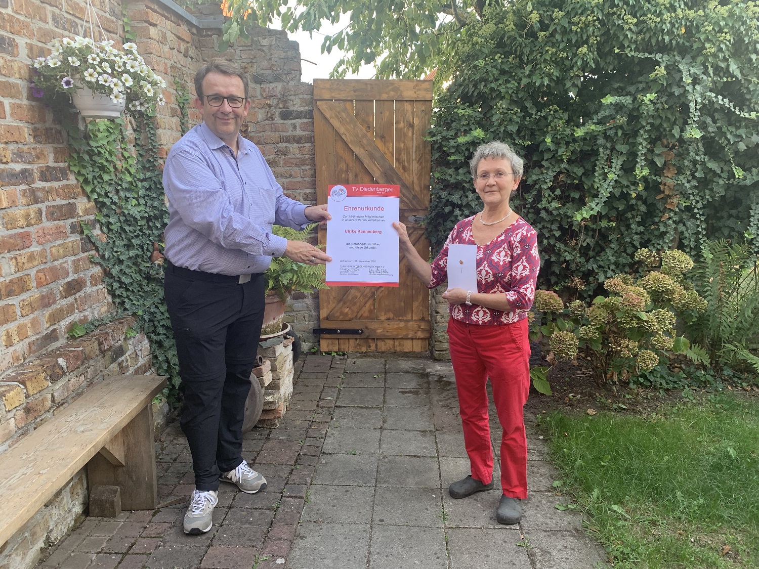 Jährlich werfen wir einen Blick in unserer Mitgliederdatei und freuen uns immer wieder, wenn wir Mitglieder sehen, die dem TVD schon sehr lange die Treue halten. Hierfür haben wir auch eine Ehrungsordnung verabschiedet. In diesem Jahr gab es 4 Jubilare mit mindestens 25jähriger Vereinszugehörigkeit, 4 Jubilare mit 40jähriger Vereinszugehörigkeit und 27 Mitglieder halten dem Verein schon 10 Jahre die Treue. Da die sonst übliche Dankeschönfeier wegen Corona ausfallen musste, haben wir uns überlegt, wie wir den Jubilaren gratulieren könnten. Ein Verzicht oder ein rein schriftlicher Kontakt schieden da für uns aus. Wir haben uns für den „Hausbesuch“ entschieden. Nicht im ärztlichen Sinne sondern im sportlichen. Ein guter Einfall, wie sich zeigen sollte. Überall wurden wir freudig und offen erwartet. Und obwohl wir ein Danke aussprechen wollten wurden uns meist Getränke angeboten. „Uns“ – das ist Georg Stang-Delto, Vorstand für die Mitgliederbetreuung (im Bild rechts) und Christian Peter, Sprecher des Vorstands (im Bild links zu sehen). Es war immer wieder interessant und auch bewegend, welche persönlichen Geschichten und teils Schicksale dazu geführt hatten, damals Mitglied im TVD zu werden. Wir danken an dieser Stelle aber auch all denjenigen mit „unrunden“ Jubiläen. Die Verbundenheit zum TVD und die langjährigen Mitgliedschaften sind Merkmale, die wir nicht missen möchten. Insofern ein schönes Erlebnis für alle Beteiligten. Wir sagen danke für die offene Freundlichkeit!