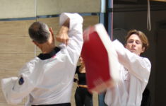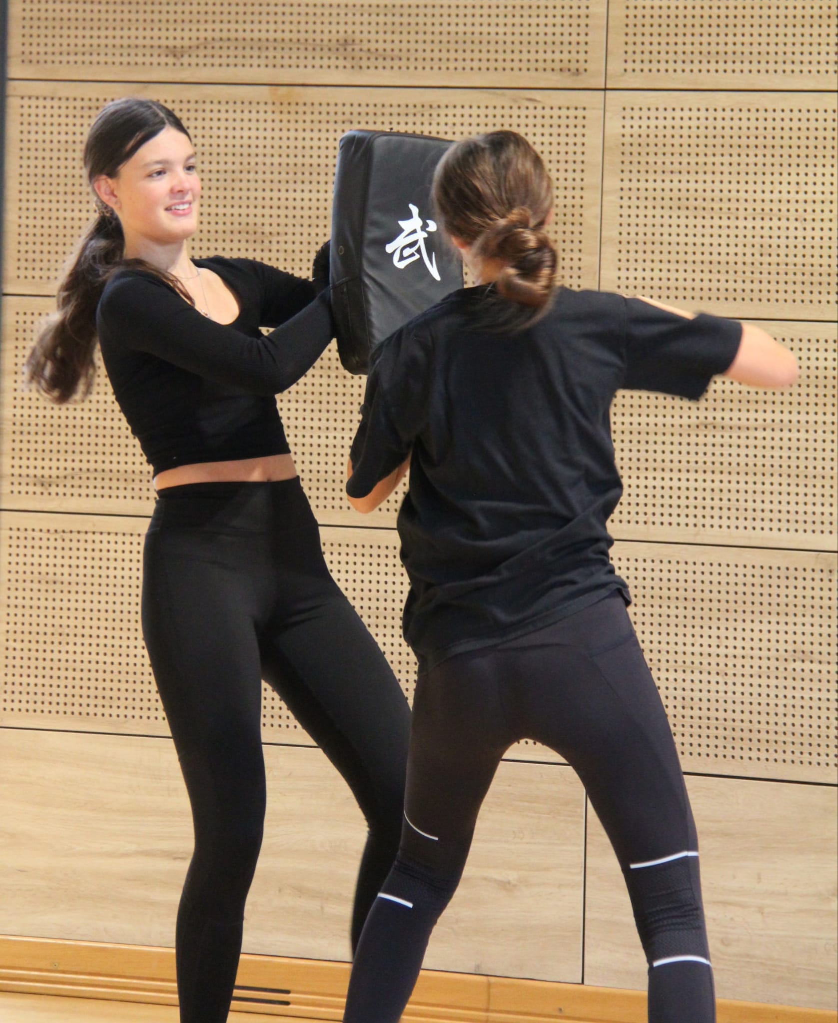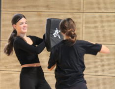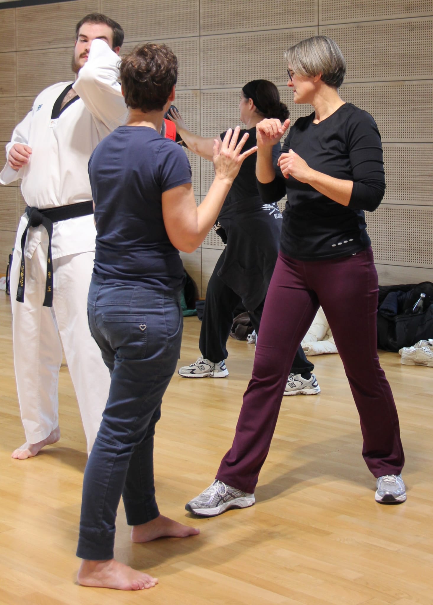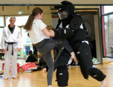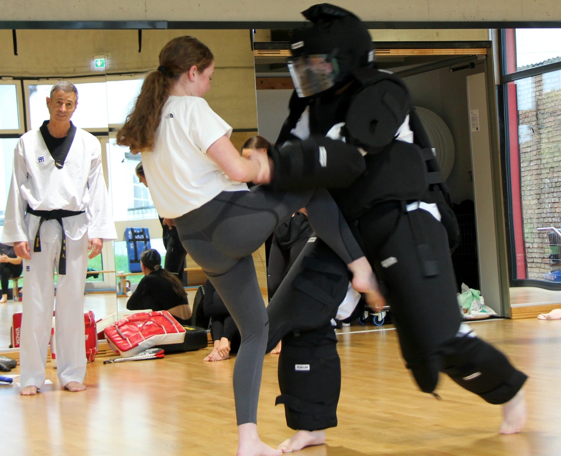 Praktisch geübt wurde, realitätsgetreue Angriffe abzuwehren. Bei den Übungen konnten die Teilnehmerinnen die gezeigten Schläge, Tritte und Ellenbogenstöße an Schlagkissen mit voller Kraft anwenden und so deren Wirkungsweise realitätsnah ausprobieren. Als Highlight konnten die Teilnehmerinnen ihre Schläge und Tritte sogar an einem in einen Vollschutzanzug gesteckten männlichen Sportler der Taekwondo Abteilung ausführen.
