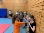 Kampfsportabteilungsleiter Patrick Meik (3. Dan) erarbeitete mit seinem Trainer- und Helferteam Ramon Benmesbah (1. Dan), Philip Viertel (1.Dan), Anja Walk und Lars Hagena ein Programm für den anderthalbstündigen Workshop.