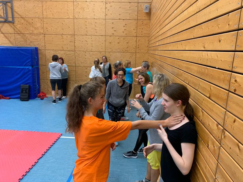 Im ersten Schritt wurde den Teilnehmerinnen Kommunikations- und Deeskalationstechniken vermittelt, um einen körperlichen Übergriff zu vermeiden. Außerdem lernten sie, wie man effektiv die Aufmerksamkeit anderer Menschen erzeugen kann.